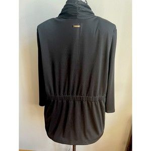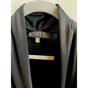 Elevate your wardrobe with this timeless Kasper women's black cardigan. Perfect for work or play, this pre-owned cardigan features an open front design, long sleeves and is made of high-quality polyester material. The back is fitted with a hidden elastic waist.