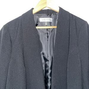 Timeless black open front blazer with drape collar and shorter, on-trend length. Wide, 3/4 length sleeves. Perfect for the office, special occasions, or for polish over a t-shirt with a pair of jeans. Excellent preowned condition. Dry clean only.