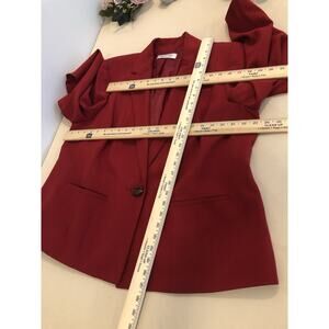 The Kasper Women's Plus Jacket in size 18W is a stylish and sophisticated option for formal and business occasions. Made from a polyester blend, this one-button executive career blazer features a lapel notch collar, lined interior, shoulder pads, and pockets. The jacket has a solid red color with a short length and long sleeves, making it a perfect addition to any woman's wardrobe. Designed by Kasper, this blazer exudes a colorful and preppy vibe, perfect for those looking to make a statement in the office.