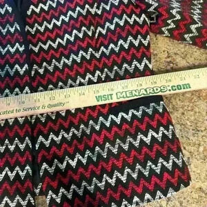 Add a pop of color to your wardrobe with this beautiful Kasper blazer. The red, white, and black zig-zag pattern is perfect for any occasion, whether it's a wedding or a business meeting. This blazer is made with a blended fabric of polyester and cotton, and is lined with 100% polyester for added comfort. It features a single-breasted cut with a clip front button style and 3/4 sleeves. The waist length can be seen in the pictures provided. This blazer is perfect for any woman looking for a colorful and classic addition to her wardrobe.