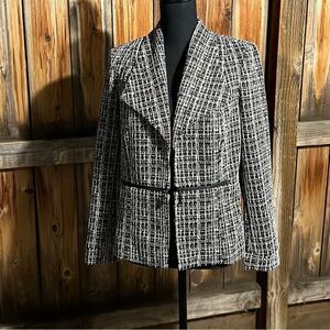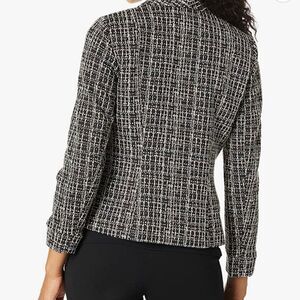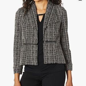 Kasper knit blazer has long sleeves with an open front, brown/tan geometric print, lined, small shoulder pads, silver zipper decoration that actually zip(see pic), 98% polyester/2% elastane