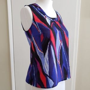 Abstract print sleeveless blouse. Has a neck detail. Preowned in excellent condition.