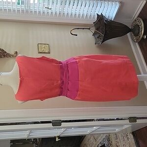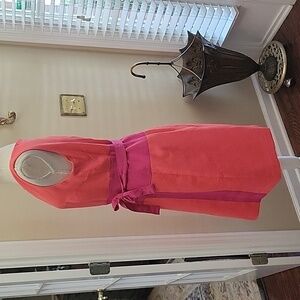 Kasper coral and fuchsia sleeveless dress with self fabric belt that ties at waistline. Fully lined Hidden back zipper. Linen like fabric is 100% polyester Size 14. Approximate measurements 21" from pit to pit. 18" across waist 23" across hips. 40" from shoulder to hem. Excellent pre owned condition. Smoke free and pet free home
