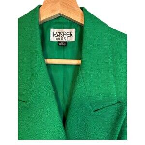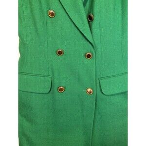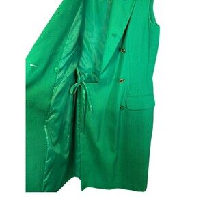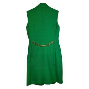 Chic and tailored Kasper for ASL sleeveless blazer wrap dress in bold green. Features gold-tone buttons, chain detail accent on the back, and a double-breasted style. Made of polyester and viscose for a structured yet comfortable fit. Perfect for work, events, or a statement piece.