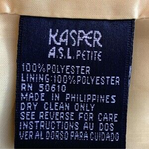 Kasper for A.S.L Petite Skirt Suit Womens 8P Yellow Polyester 4 Button Jacket. 100% Polyester. Jacket has pointed collar, shoulder pads, cuffless long sleeves, straight fit, fully lined. Skirt is straight, front darts, back zipper, back kick pleat, fully lined. Very nice business suit or evening occasion. Verified measurements -