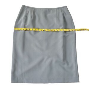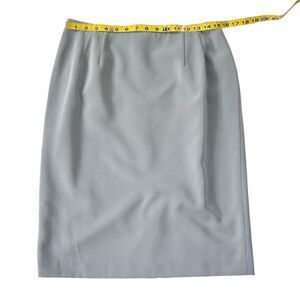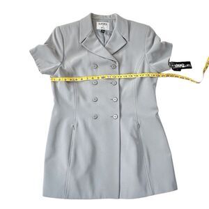 Description: Kasper for ASL Vintage Gray Short Sleeve Double Breasted Skirt Suit. Long jacket a jacket has a zipper detail on pockets. The jacket is paired with a matching skirt that has a classic pencil silhouette, a concealed zipper with hook and eye closure. Jacket and skirt fully lined. This suit is ideal for a business meeting, a job interview, or any other event where you want to look your best. Extra button for jacket included. Comes from a smoke free home.