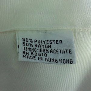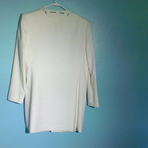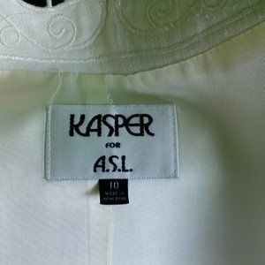 Kasper for A.S.L. size 10 jacket with 2 pockets and eyelet edging around neck and down front. Comes with shoulder pads which can be easily removed. Made in Hong Kong. RN 50610. 50% polyester; 50% rayon; lining: 100% acetate. Dry clean only. Measures approximately 19" from underarm to underarm; 32" neck to hemline. Sleeves 23.5' from shoulder seam to wrist. In excellent condition.