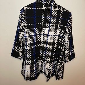 Super cute patterned blazer- Black, white and royal blue. Looks great with white jeans, pencil skirt, or dark skinnies!