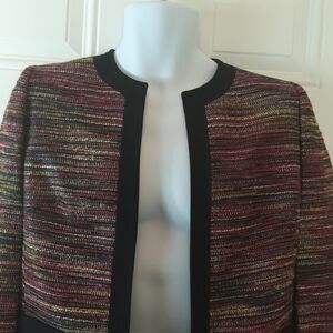 Kasper mix master blk muilti/red fully lined open front jacket with faux pockets.
