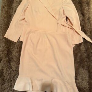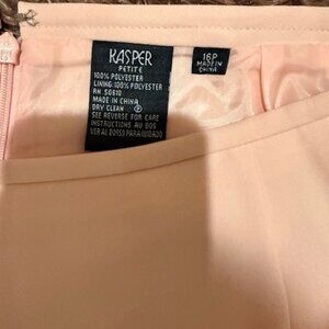 Kasper size 16P orange 2 piece suit. Quality at it's best. Beautiful with an attached side belt. Worn once at a special occasion at church. Lining in both the jacket and skirt. Skirt 24” from waist to hem, 22” in the hips. Jacket shoulder to sleeve: 23” with a slit. Mannequin is smaller than the suit and was pinned to fit mannequin. please see actual size. Has been hanging in closet will reduce by $15.00 for dry cleaning. Send me an offer for $60.00 and I will accept.