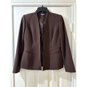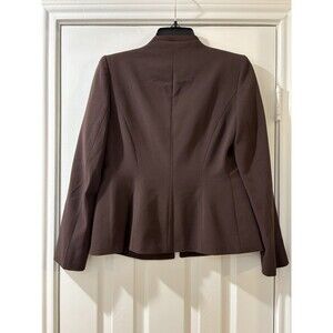 Kasper women's Brown Faux Suede Trim Short Blazer Suit Jacket, size 2P 2 Petite, fully lined darted fitted style, 3 bronze metal hook & clasp front closure, long sleeve.