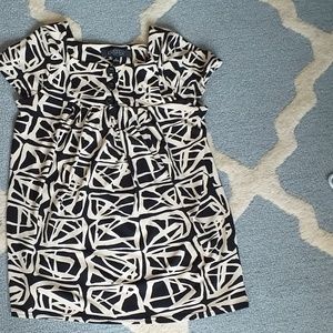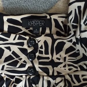 Kasper black and tan patterned box neck top with short sleeve cap and the large black decorative neck buttons. Long and Stretchy can be maternity