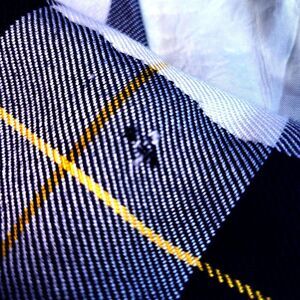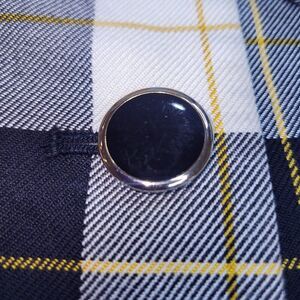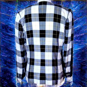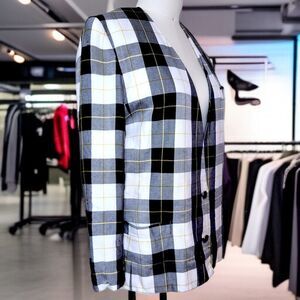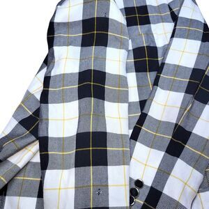 Features: Retro-inspired plaid blazer with oversized black, white, and gray check pattern highlighted with thin yellow stripes. Two-button closure, lined interior, and a tailored fit. There are 2 small fabric production flaws on the right sleeve. Shown in photo, reflected in price.