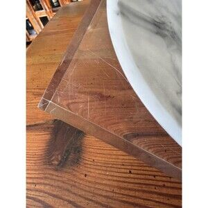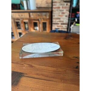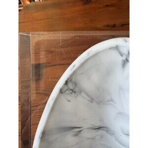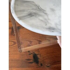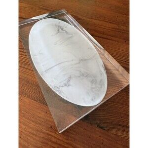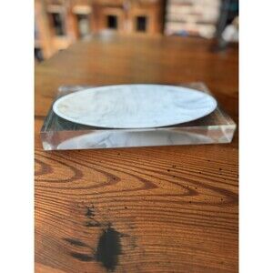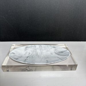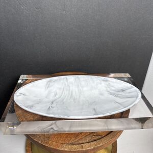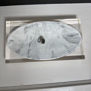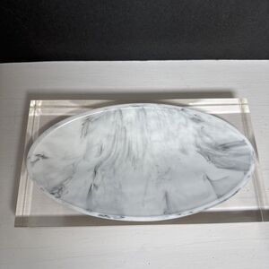 Lovely heavy acrylic tray by Kassatex Ducale. This thick clear acrylic with an oval shaped resin tray, that looks like Carrera marble, would work in just about any room in the house. It looks very modern, with very clean lines, but I can see it working in just about any decor situation. There are some scratches in the bottom of the acrylic, which would be common for this type of material with use. Please see the photos for details. **Note: jewelry is not included, for display and size demonstration only.**