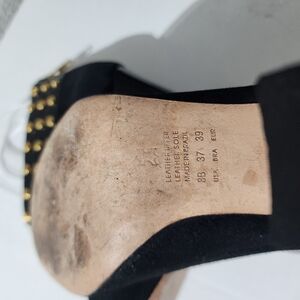 Black suede peep toe ankle booties with gold stud detailing and back zip closure. Chunky heel.