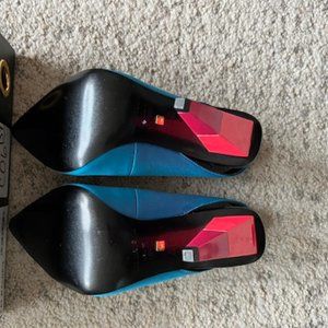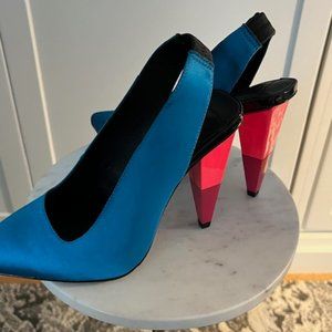 Gorgeous peacock blue satin slingback with multi-colored coral heel. Spring/Summer 2019 Main Jana. Size 37 with 4.5" heel. Never worn! New in box!