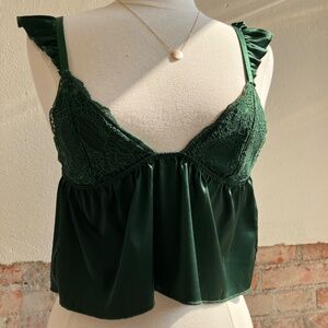 HANNA SCHÖNBERG X KAT THE LABEL Experience comfort and elegance with the Hanna Camisole in a deep Forest Green. Crafted from buttery soft satin, this camisole is embellished with delicate lace details for a classic, timeless look. Each piece in this exclusive collection was designed to mix and match. Limited edition capsule collection by Hanna Schönberg My fabrics are very delicate, please handle with care. Cold hand wash only Dry flat in shade 100% Polyester