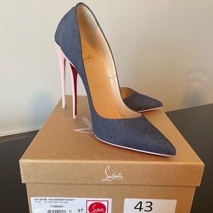 Beautiful denim with light pink heel. Wore only once. Shoes come with box, 2 duster bags, extra heel bottom for replacement.