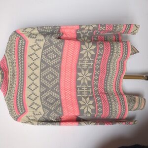 This KATE collection cardigan sweater features a tribal geometric print in pink, gray, and cream. The open-front design includes a waterfall or draped collar and long dolman sleeves. The oversized, stretchy knit is made of 100% acrylic.