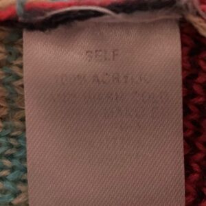 Vibrant knit sweater with a mix of blue, red, and tan hues. Perfect for cozy days.
