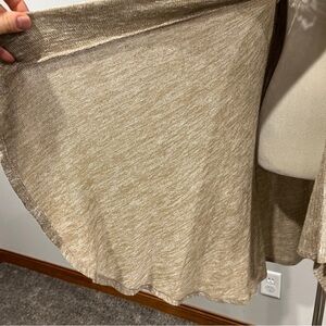 Chic knit cardigan. Features a blend of tan and cream. Ideal for layering.