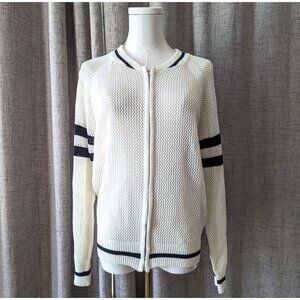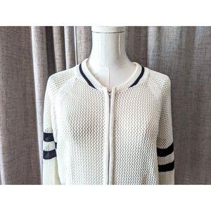 Elevate your wardrobe with this white mesh knit sweater from Kate Collection. Featuring black stripes and a convenient zipper front, it exudes effortless chic.