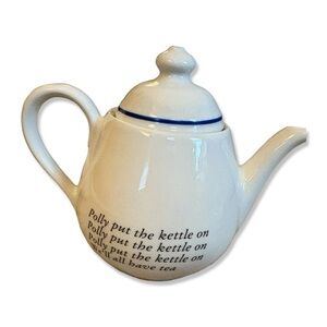 Nursery rhymes featured include Little Jumping Joan, Little, Bo-Peep, Little Tommy Tucker, and Little Miss Muffet. The teapot has the "Polly Put the Kettle On" verse on the back. The mugs have verses on one side.