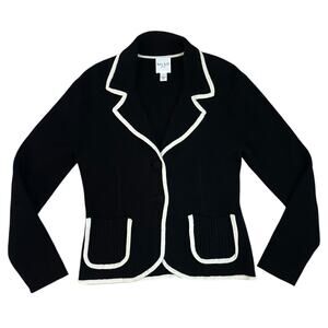 Chic Kate Hill Petite cardigan sweater jacket in a black knit with contrasting ivory trim. Designed in a blazer style with notched collar, two-button front, and front patch pockets. Soft, structured, and versatile — perfect for workwear or elevated casual looks.