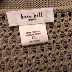 Kate Hill large petite Sage/Taupe One Button 3/4 Sleeve Crochet Cardigan - color is closer to a taupe or Khaki - leaning towards a sage. It's a thicker crochet and good for autumn or air conditioned summer indoor. Very pretty and roomy Large petite. I'll post more pics upon request! Someone might be looking for just this style. Benefits a womens mission.