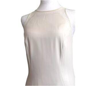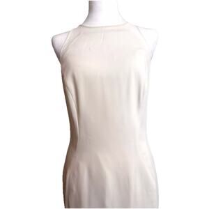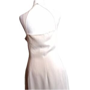 This Kate Hudson Ann Taylor dress is a stylish ivbory knee-length pencil dress with a halter neckline and a backless design featuring a cut-out detail. The dress is sleeveless and has a hook & eye closure, perfect for formal occasions like weddings, cocktail parties, or holy communions. Made of polyester and spandex satin fabric, the dress is designed for summer or spring events and is recommended to be dry cleaned only. The elegant yet modern design is ideal for a bride or bridesmaid, with a touch of designer flair suitable for bachelorette parties, weddings, or baby showers.