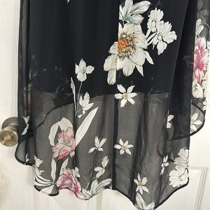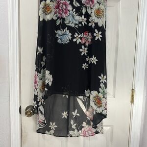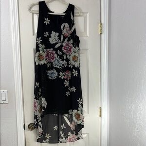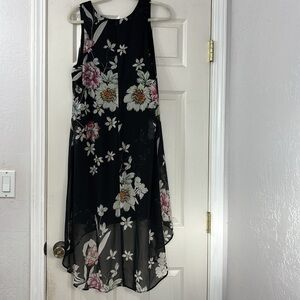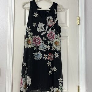 Good condition with minor wear. Small stain pointed out in photos. See photos for details and measurements. Lining. Made in the USA. Elegant sleeveless dress featuring a beautiful floral pattern on a black background. Perfect for any occasion.