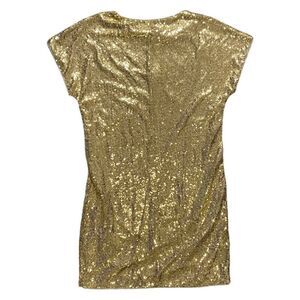 Kate Kasin allover gold sequined mini cocktail dress with short sleeves.