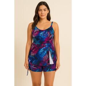 New with tags Kate Kasin two-piece tankini swimsuit set in a colorful tropical print. Includes a scoop-neck tankini top with adjustable straps paired with matching swim shorts. Size Small.