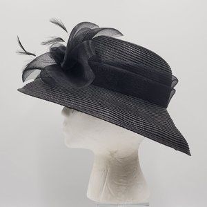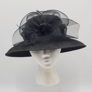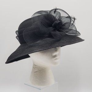 • beautiful, black sheer, double layer tulle hat band with rosette / flower & coque feather accents