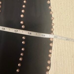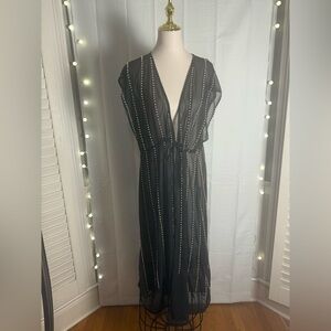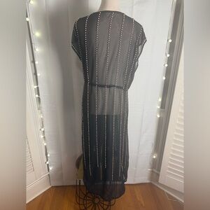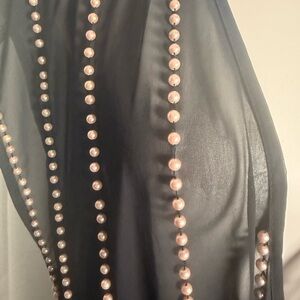 Stylish black sheer cover-up with faux pearls sewn up and down cover up. Ideal for layering.