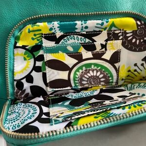 Kate Landry teal leather bag with front pocket, top zipper, green, teal, blue, yellow, brown and white silk design inside. Faux leather. No handle, hobo style. Used but good condition.