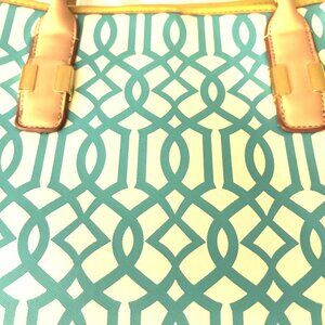 Kate Landry Tote "Like New" Teal/Yellow/White Lattice Design Gold Hardware