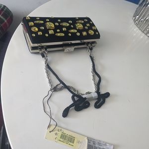 *missing one small rhinestone-like jewel on clasp. Possible upcycle project? For someone crafty an easy fix. Priced accordingly. Still beautiful, unworn, and with two options for a chain strap or longer fabric strap. From Dillards in Estero FL.