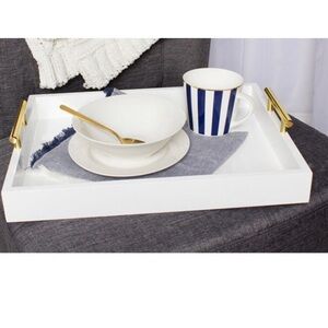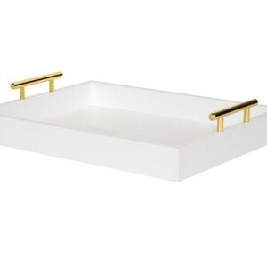 DECORATIVE GOLD TRAY: This tray features a white finish on sturdy MDF with glam gold-painted metal handles