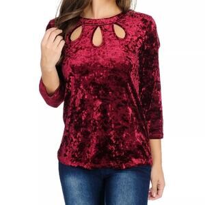 This Kate & Mallory top features a luxurious crushed velvet texture and a unique keyhole neckline. Perfect for adding a touch of elegance to your wardrobe.