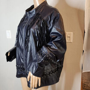 Kate & Mallory Vegan Leather Navy Blue fringe lace up zip jacket. Women's 3X