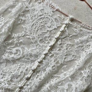 Selling the gorgeous cropped lace topper I wore for my wedding, This is a large lace patterned garment that is meant to be worn over a dress/top (not included). Larger scalloping at hem line, and smaller scalloping at cuffs. Button fasteners at back of garment. Boatneck neckline. This garment was custom-made, but I would approximate it as being close to a size 6. For reference, I wear a size 34A. Gently worn.