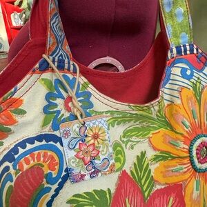 Kate McRostie Art Ikat Floral Canvas Bag Purse Tote; barely used- no smells, clean, no rips, stains, nor discolorations. These are photos of the actual item and not stock photos. This is a sturdy tote bag; the colors are vibrant; hand-painted and hand embroidered. Zoom in for product details and design and serious inquiries only please.