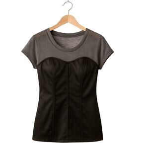 Keywords: Kate Moss Topshop, corset top, satin overlay tee, gray burnout shirt, statement top, edgy streetwear, rare collab, collector’s fashion piece, trendy tops for women, Y2K fashion