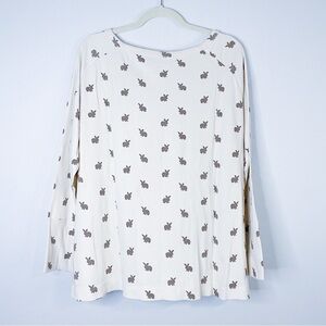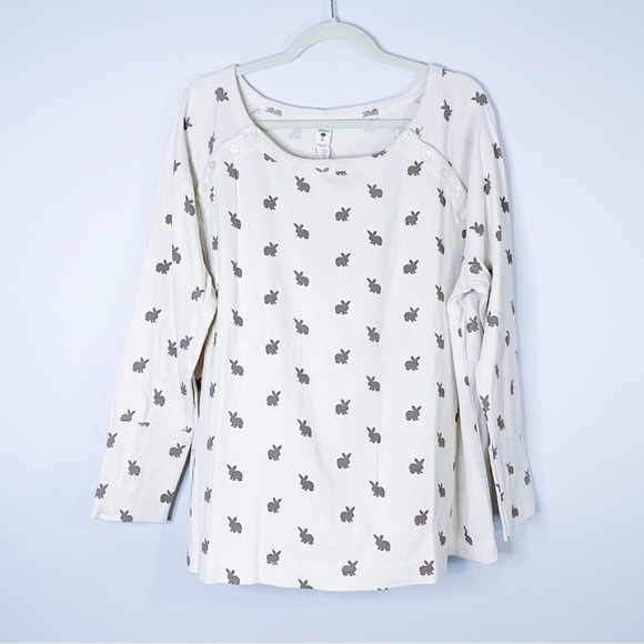 Kate Quinn cream long sleeve top with bunny print. Button details at shoulders.