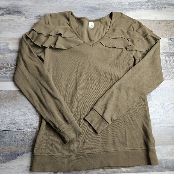 Kate Quinn Long Sleeve V-Neck Ruffle Top Olive Green Medium