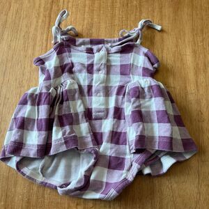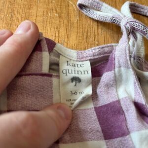 Kate Quinn brand purple gingham skirted bodysuit with spaghetti strap ties. Size 3-6 months. Minor wash wear, see photos please.