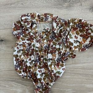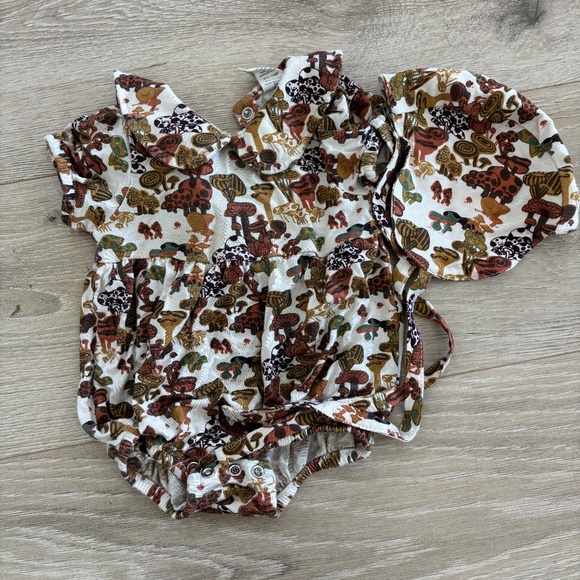 The cutest mushroom print Kate Quinn one piece. The sweetest collar. Includes matching bonnet