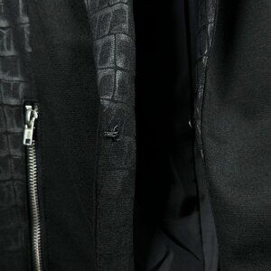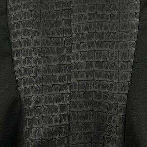 This is a sophisticated and modern jacket from Kate Rosy, perfect for adding a touch of edgy style to your wardrobe. The jacket features a unique and striking design, with a black body contrasted by faux crocodile or alligator pattern on the lapels, down the front and on the back. The one-clasp closure offers a clean, streamlined look, and the two side zippers are a stylish, functional detail. Made from a comfortable blend of Polyester, Rayon, and Spandex, this jacket provides a flattering fit with just the right amount of stretch. It's a versatile piece that can elevate a casual outfit or complete a professional look.