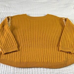 This is a mustard yellow knit sweater with contrast whipstitch detailing on the shoulders and sleeves. Soft and fun! Great for any occasion.